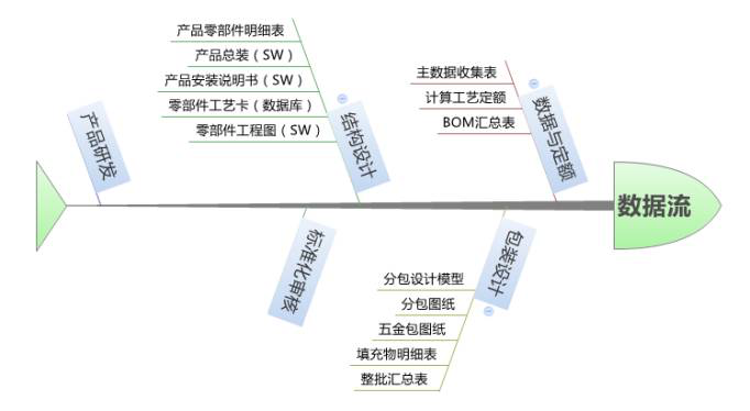 最終形成產(chǎn)品的材料明細(xì)表、總裝模型、加工圖紙、零部件工藝卡等。再交由包裝設(shè)計人員進行分包設(shè)計,形成分包模型、包裝BOM、五金包圖紙、填充物明細(xì)表等設(shè)計數(shù)據(jù)。最后交由數(shù)據(jù)定額人員,制作最終的產(chǎn)品BOM以及編制工藝定額。