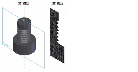 我們可以在截面平面上創(chuàng)建平面區(qū)域體或草圖,以創(chuàng)建 2D 截面。